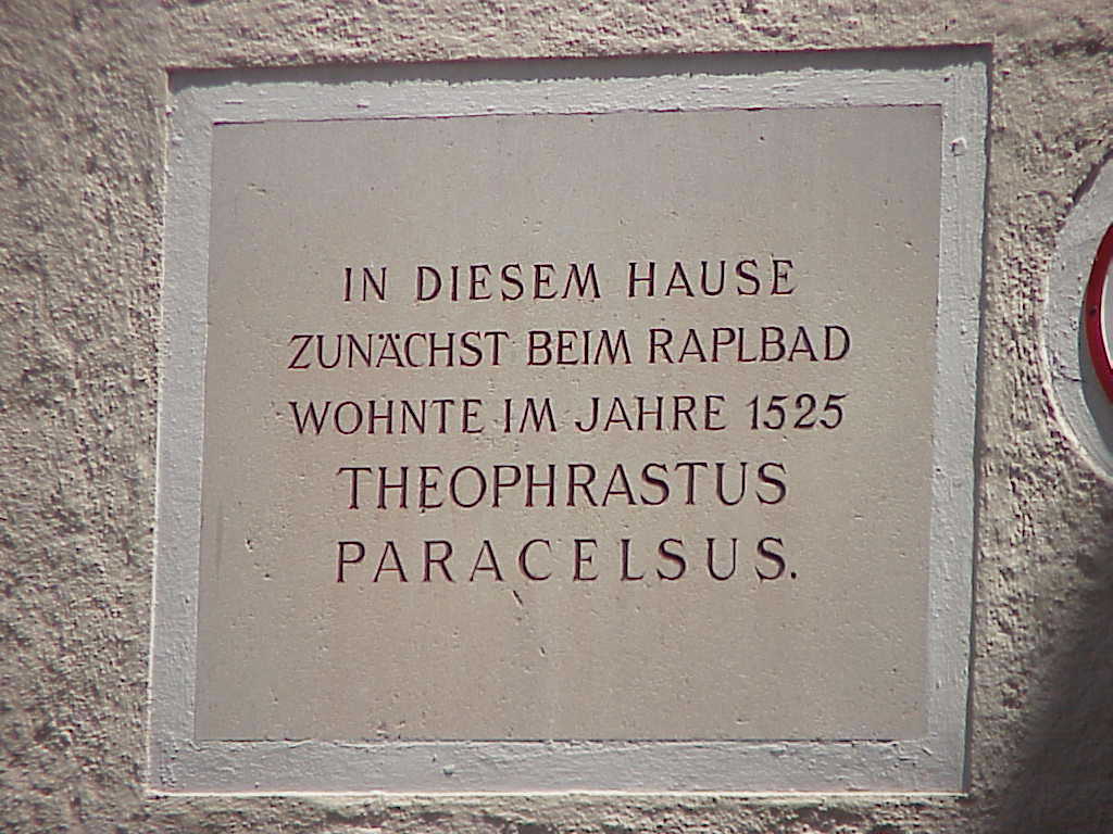 Salzburg, Austria/salzburg060Previous | Home | Next"In this house next to the rapl-bath Theophrastus Paracelsus lived in 1525." A "rapl-bath" is a community bath, used by those who do not have their own bath facilities. This house also was close to the "Kampfmühle," a mill powered by water brought in from the river by a trough. |