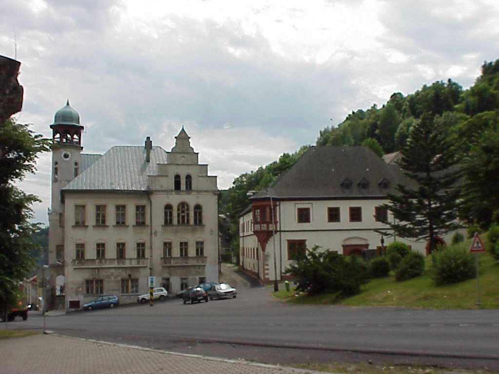 Just next to the city hall (left) is the old mint (right). The St. Joachims Church is behind the viewer's right shoulder.