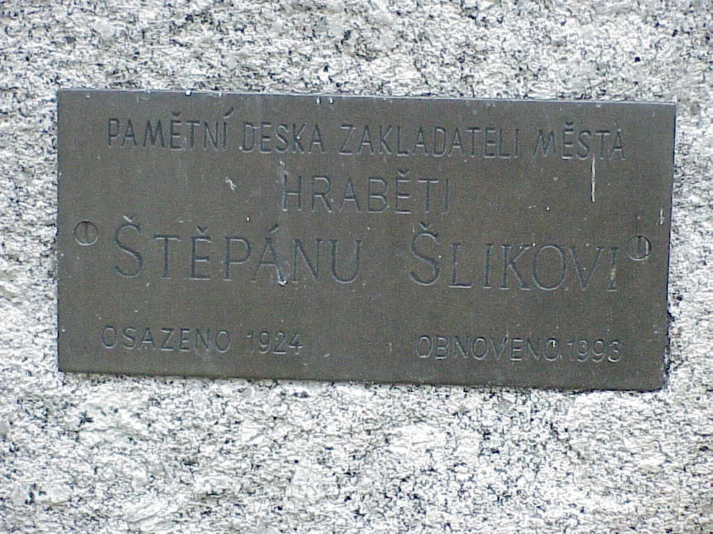 Below is a plaque in Czech: "Pametní deska zakladateli mesta hrabeti Štepánu Šlikovi.