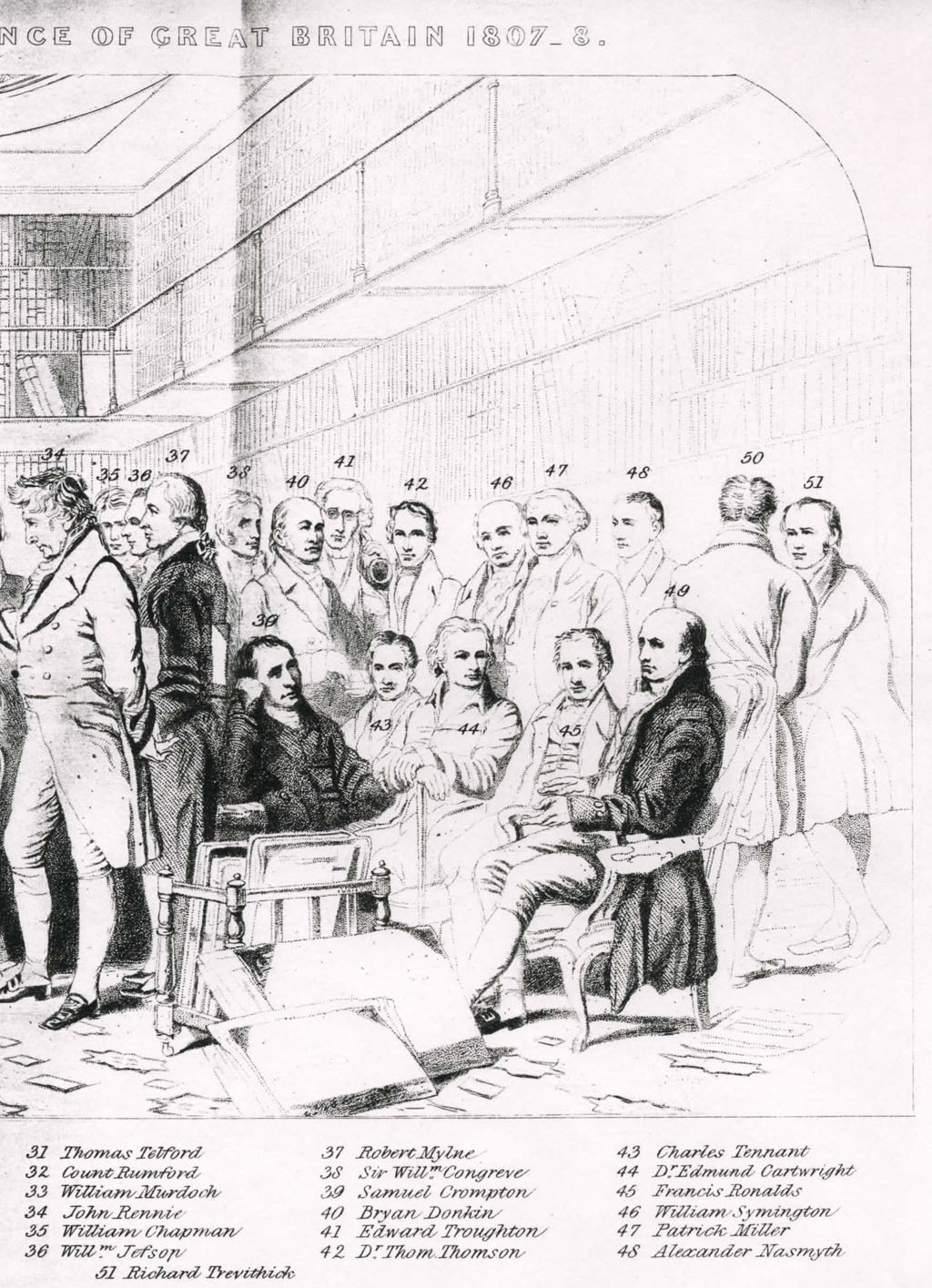 Thomas Thomson (42) developed important detailed histories of chemistry which are still used today {LINK: London2B-500}. Richard Trevithick (51) built the first steam locomotive and passenger train. This list is not all-inclusive; notable missing persons include Smithson Tennant, discoverer of iridium and osmium and close associate of William Hyde Wollaston. The fact that no known portrait exists of Tennant is not the reason for his absence here, since none exists for Joseph Bramah (50), whose back is shown (he was inventor of the hydraulic press; he was issued patents on the flushing toilet and the beer pump). Also missing is Count Rumford, the founder of the Royal Institution.