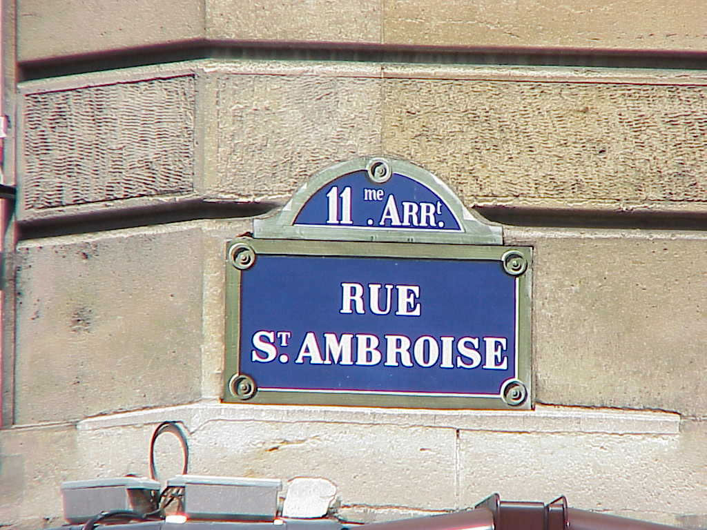 Paris folder A/parisA060Previous | Home | NextRue Saint-Ambroise is about 1 km north of Sainte-Marguerite. This street sign tells us that Rue Saint-Ambroise is in the 11th arrondissement. It is not known exactly when the son Bernard Courtois moved to this address, but it was sometime during the period 1807-1810. |