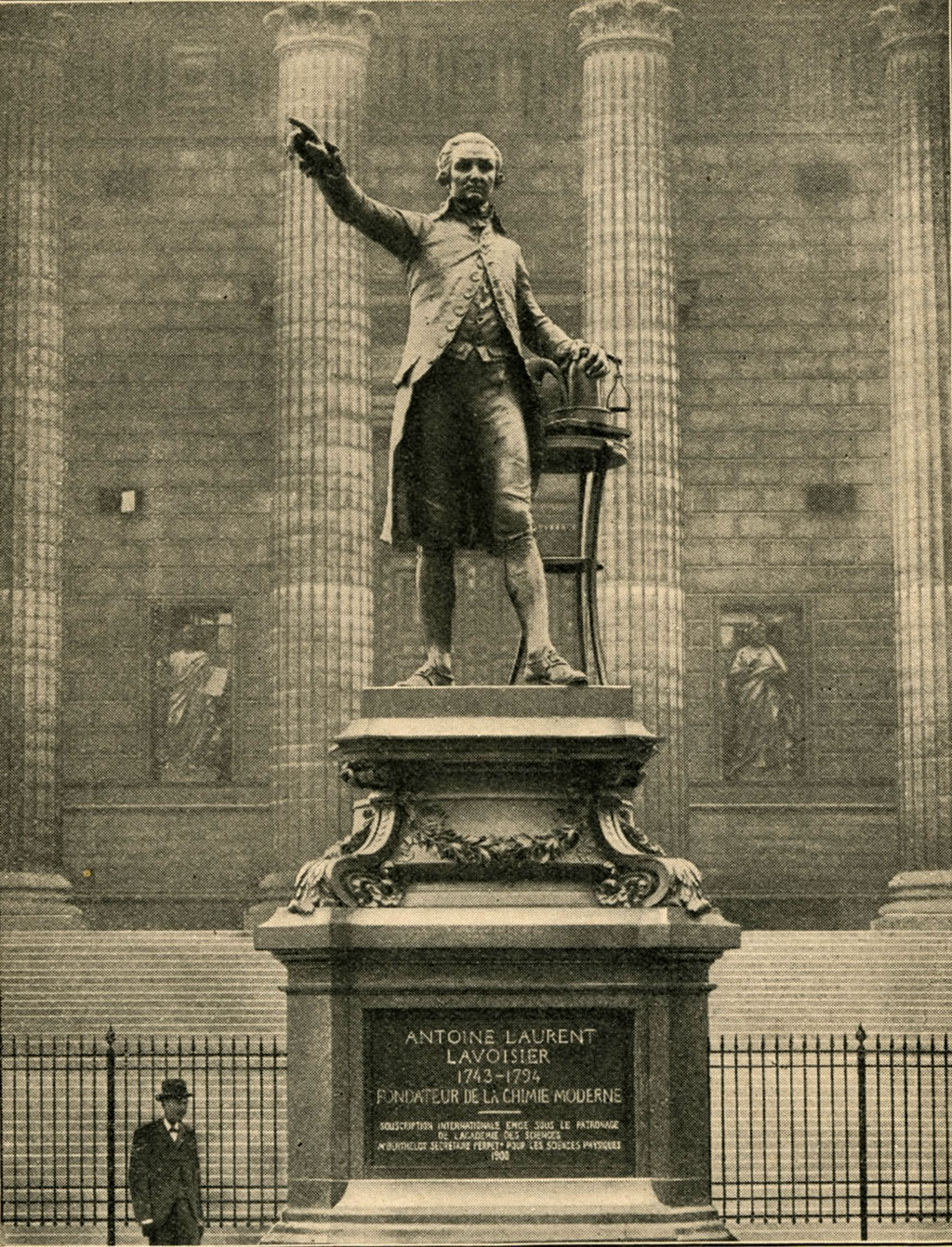 This magnificent bronze monument of Lavoisier, inaugurated 27 July 1900, once stood on the Place de la Madeleine in back (north side) of the church (hence, the view is south). Marcellin Pierre Eugène Berthelot (1827-1907), French chemist and politician, was to preside over the ceremony, but illness kept him away and the address was read by Jean Gaston Darboux (1842-1917), French mathematician. The inscription below: "Antoine Laurent Lavoisier 1743-1894. Founder of modern chemistry. Erected by public subscription, under the patronage of the Academy of Sciences. M. Bertholet, Permament Secretary of the Physical Sciences, 1900." Moissan was an active participant in raising support for the statue.