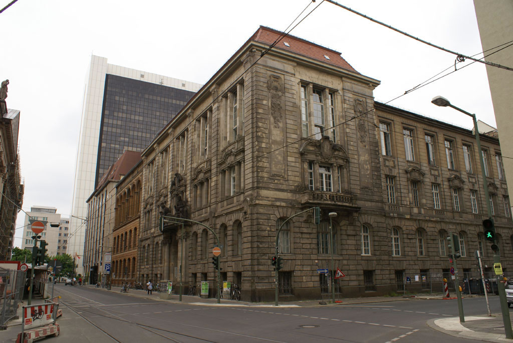 Looking westward along Dorotheenstraße; the nearest corner is the intersection of Dorotheenstraße and Universitätstraße. On the northwest corner of this intersection, the large gray building was once the Museeum für Meereskunde (Oceanography Museum), now used by the Philosophy Department of the Humboldt University.