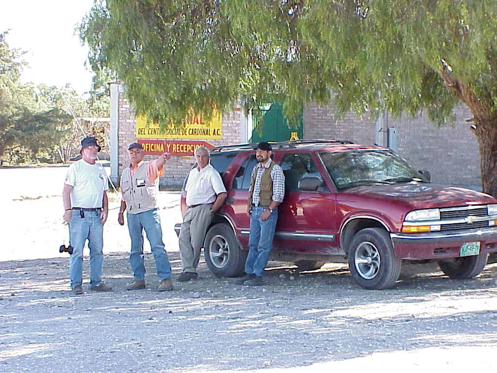 Mexico/mexico300Previous | Home | NextThe expedition to Lomo de Toro and to Purísima del Cardonal mines was hosted by (right to left) mining engineer Alejandro Contreras, Compañía Fresnillo S.A. de C. V. Unidad El Monte (who furnished the rugged van for the mountainous terrain); mining engineer Rubén Covarubias, Covamin, S. A. de C. V. Alejandro Contreras González; and Oscar Fernando Nieto de la Mora, Gerente [manager] de Unidad Minera, Peñoles Mining Company, Zimapán, Hidalgo, Mexico. |